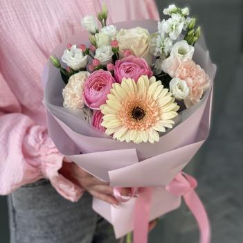 1159 р. Букет Прекрасного дня из герберы, пионовидной кустовой розы, эустомы и гиперикума