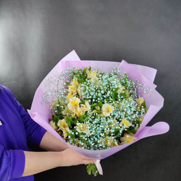 Роскошный букет который покорит любое сердце и станет достойным подарком к любому поводу. Состав Гипсофила - 4 шт. Альстромерия - 10 шт. Лента - 1 шт. Пленка - 1 шт.