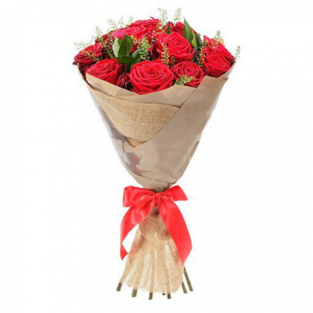 Состав: Доставка, Упаковка для букета: крафт-бумага, Роза красная 60 см 11шт., Грин белл 3шт.