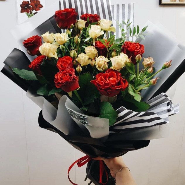 Упаковка для букета: крафт-бумага 2шт., Фисташка 5шт., Роза красная 60 см 9шт., Роза кустовая 5шт.