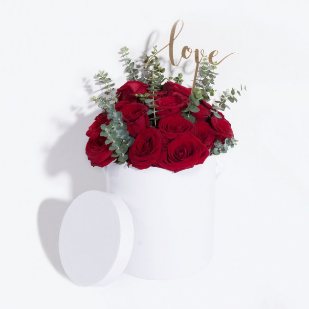 Стильный букет в коробке из 21 розы, с декором.