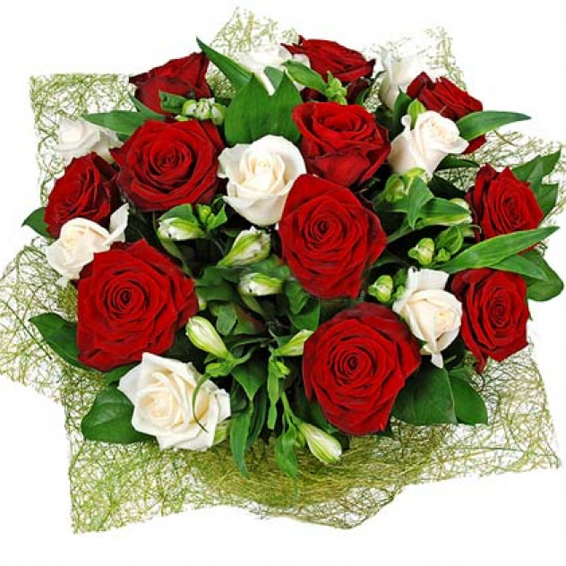 Роза красная 60 см 10шт., Роза белая 60 см 11шт., Упаковка для букета: сезаль, Альстромерия 5шт., Салал 15шт.