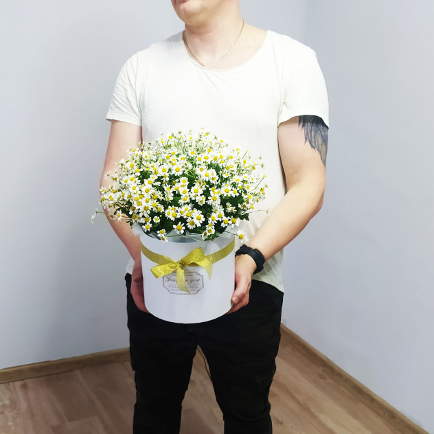 Очаровательный букет полевых ромашек в коробке.