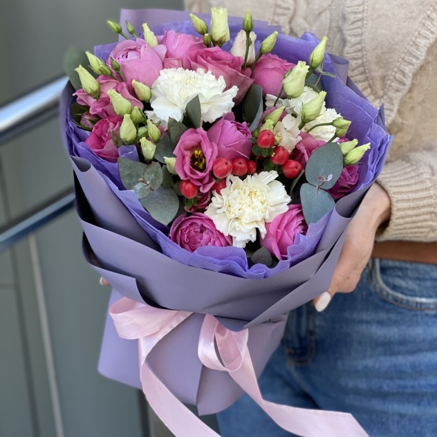Состав: Эустома 3 Эвкалипт 1 Кустовая пионовидная роза 3 Гиперикум 1 Гвоздика 3 Оформление 1