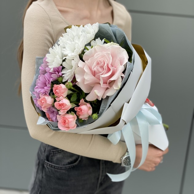 Состав: Хризантема 2 Кустовая роза 1 Роза розовая 1 Писташ 1 Оформление