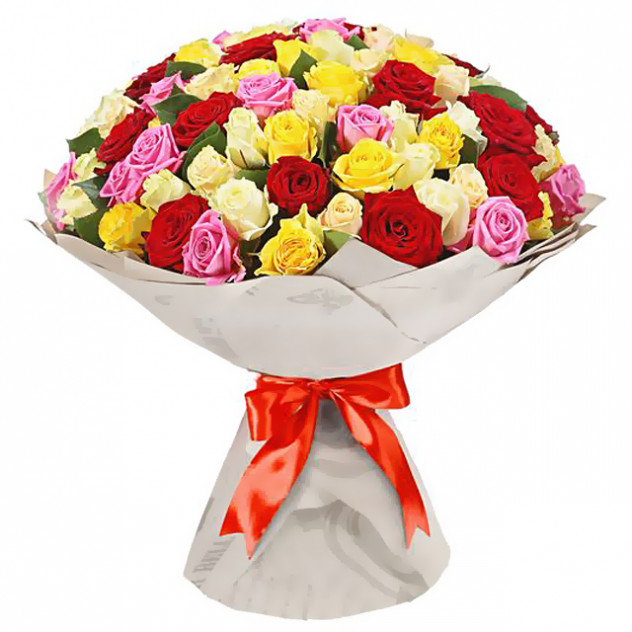 Состав: Упаковка для букета: крафт-бумага, Роза красная 60 см 12шт., Роза белая 60 см 13шт., Роза розовая 60 см 13шт., Роза желтая 60 см 13шт.
