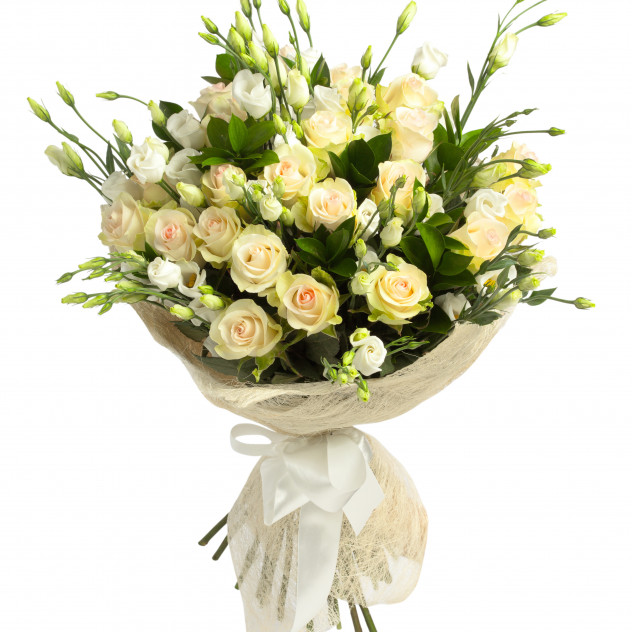 Лизиантус 10шт., Роза кремовая 60 см 19шт., Упаковка для букета: сезаль, Рускус 20шт.