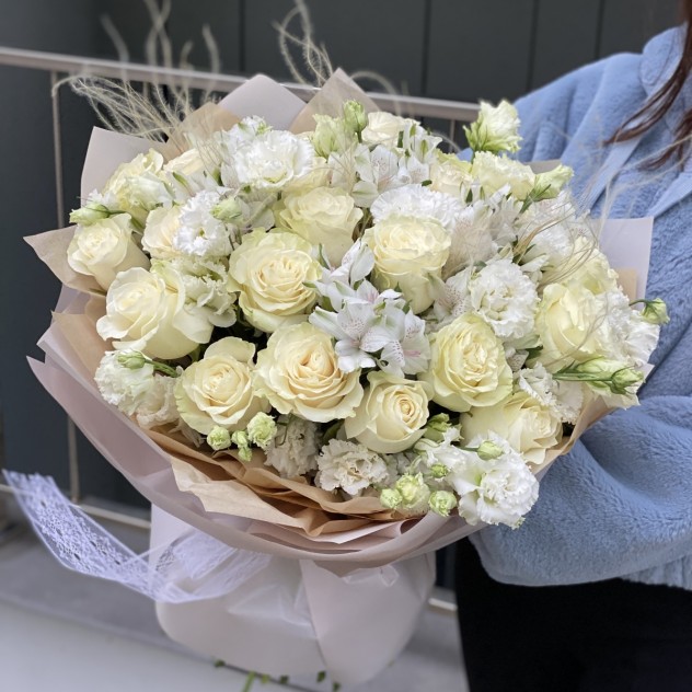 Состав: Роза сорта Мондиализм 25 Эустома сорта Целебрик 15 Стифа 3 Альстромерия 7 Оформление