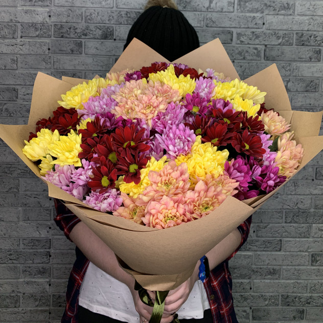 Свежий, яркий и ароматный букет из 25 хризантем